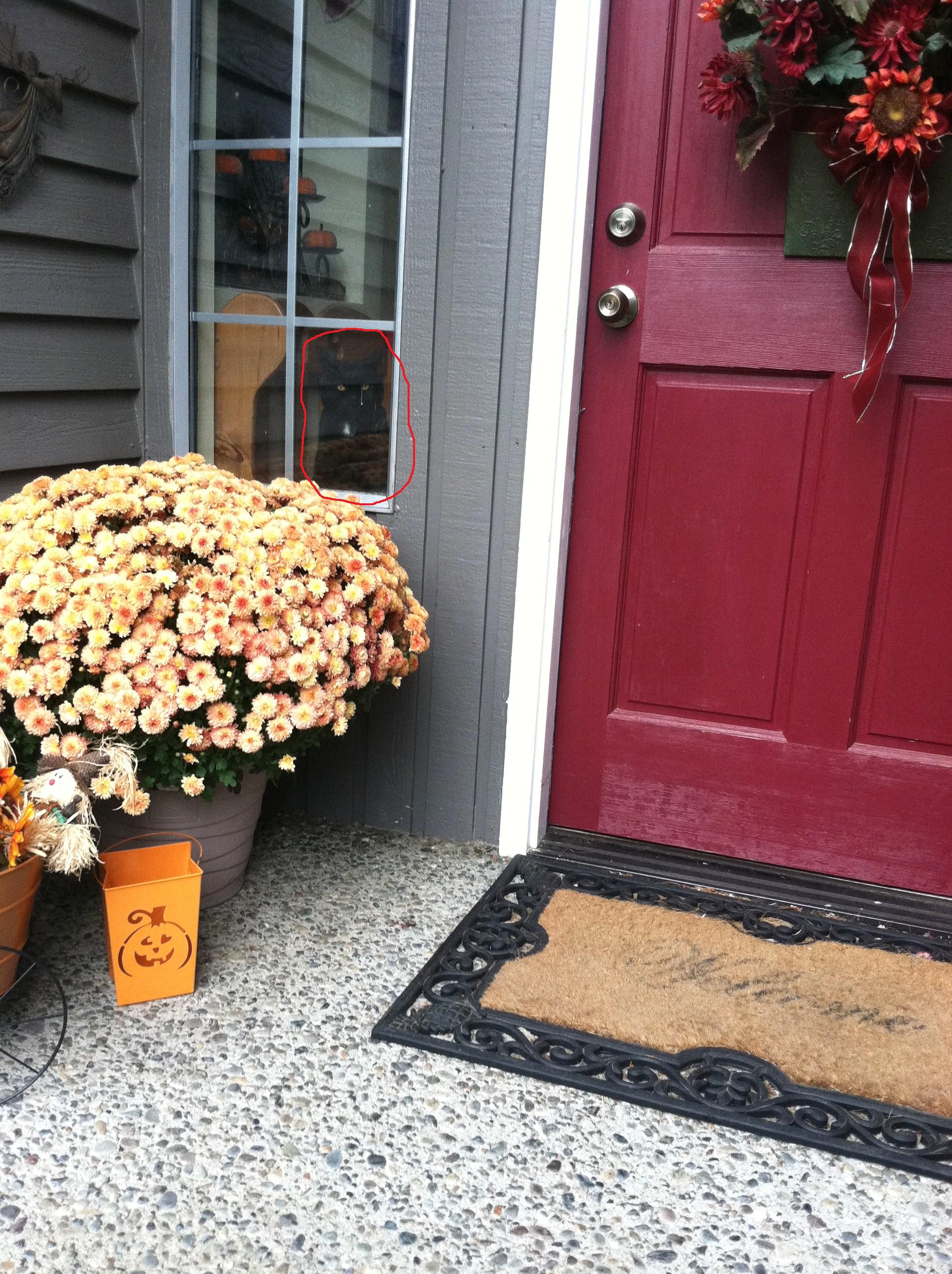 I love your cat in the window! Mine does the same thing…only he sits on his butt and his huge gut just spills out all over the floor. He scares the kids away because they all think he’s going to eat them 😛 haha.