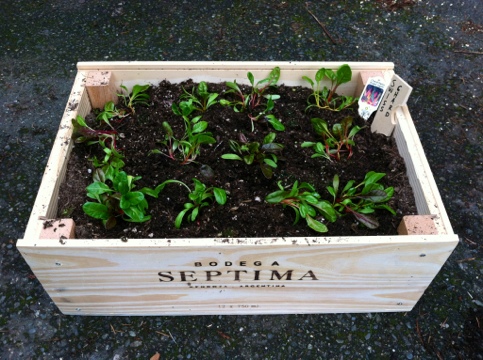 Now the fun part-Time to get dirty! Pour your soil(s) in to the boxes and plant your goods! We used two different “dirts,” one as a base soil, and one with a fertilizer to nourish the plants. From top to bottom: Walla Walla onions, beets, swiss chard, and carrots!