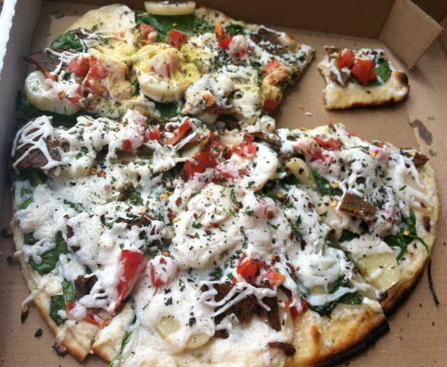 I chose the Field Roast pizza and it had: white garlic sauce, Field Roast, fresh tomatoes, spinach, and I ditched mushrooms for potatoes. Potatoes on pizza is the best. I think they also sprinkled dill on top, which I don’t really care for..but the pizza was so good I was able to ignore the dill. Plus I dumped enough red pepper and nooch on top to plug a flood hole.