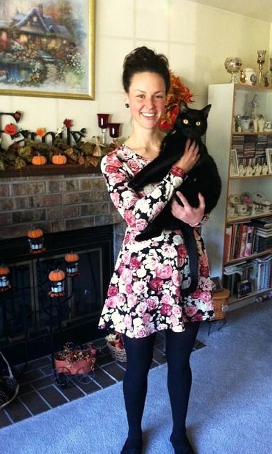 I looovovovovove that you have the same dress, in different curtian-flower patterns. So you. Your cat is huge. Geez. It is the size of your torso, which is tiny.