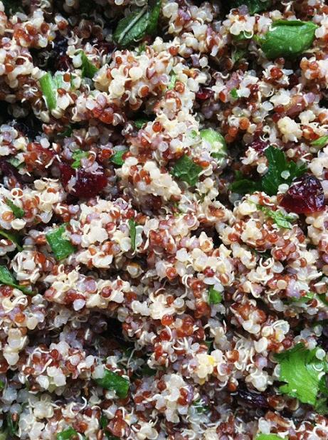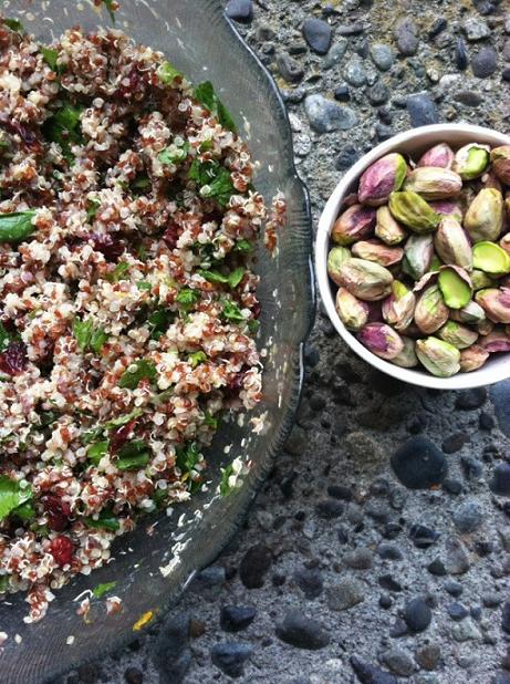 Cook your quinoa as directed on your packaging. Once your quinoa is cooked and cooled add the ingredients in the order listed. Starting with the liquids, and ending with the herbs. DO NOT add the pistachios until you are ready to serve though, this keeps them crunchy and fresh tasting. Hence the cup full of nuts on the side.