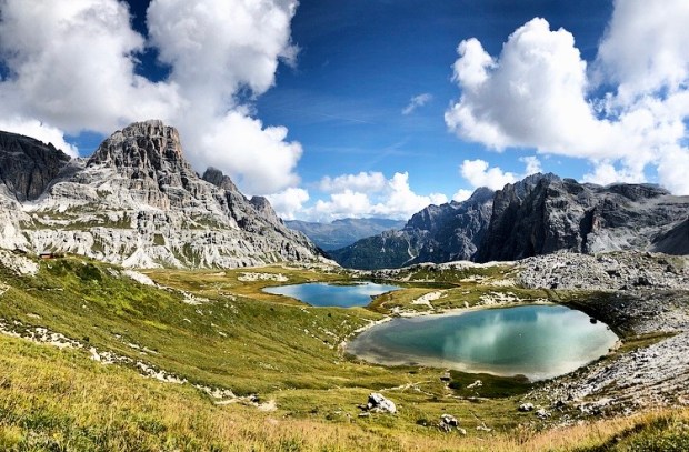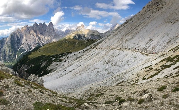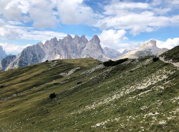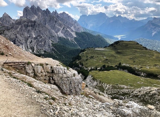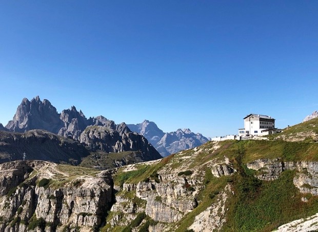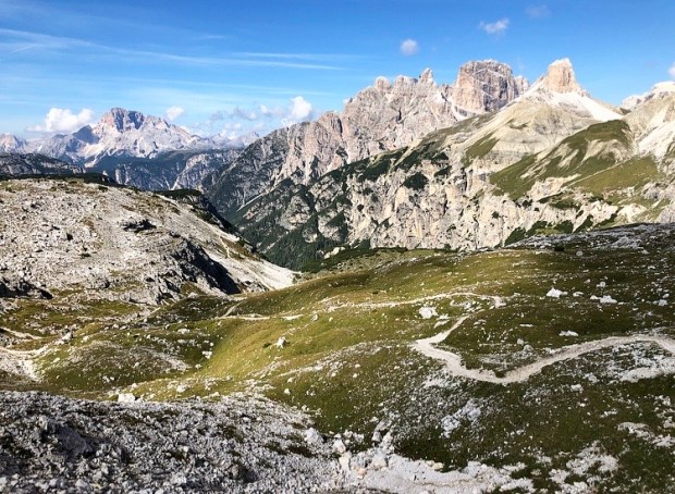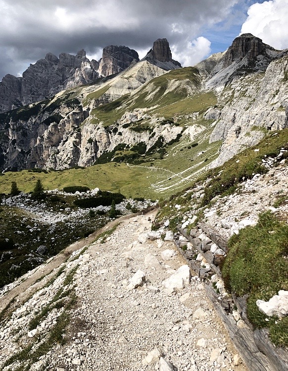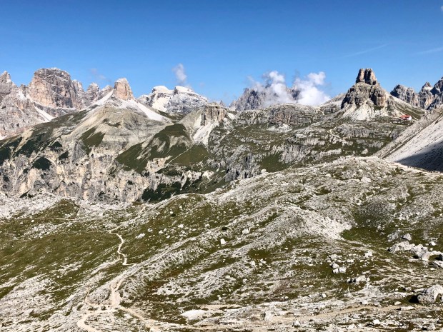 After our first wee climb, we stopped at the top of the hill to savor the views below. From here we could see our next destination, a hut off in the distance with a taste of home name. The Dolomites are so close to Germany, that everything in the area is in both Italian and German. Tre Cime is also known as Drei Zinnen, which both translate to three peaks. Our next destination on the loop was to the Drei Zinnen Hütte.