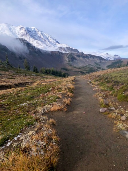 Just got back last night from hiking around the Mowich Lake side of the mountain: it’s in the NW corner of the Park by the Carbon Glacier. Highly recommend RIGHT NOW: the fall colors are mad, the weather has a couple more days of “nice” before rain hits, and you can let Duncan sleep in the car when you LEAVE EARLY for the area.