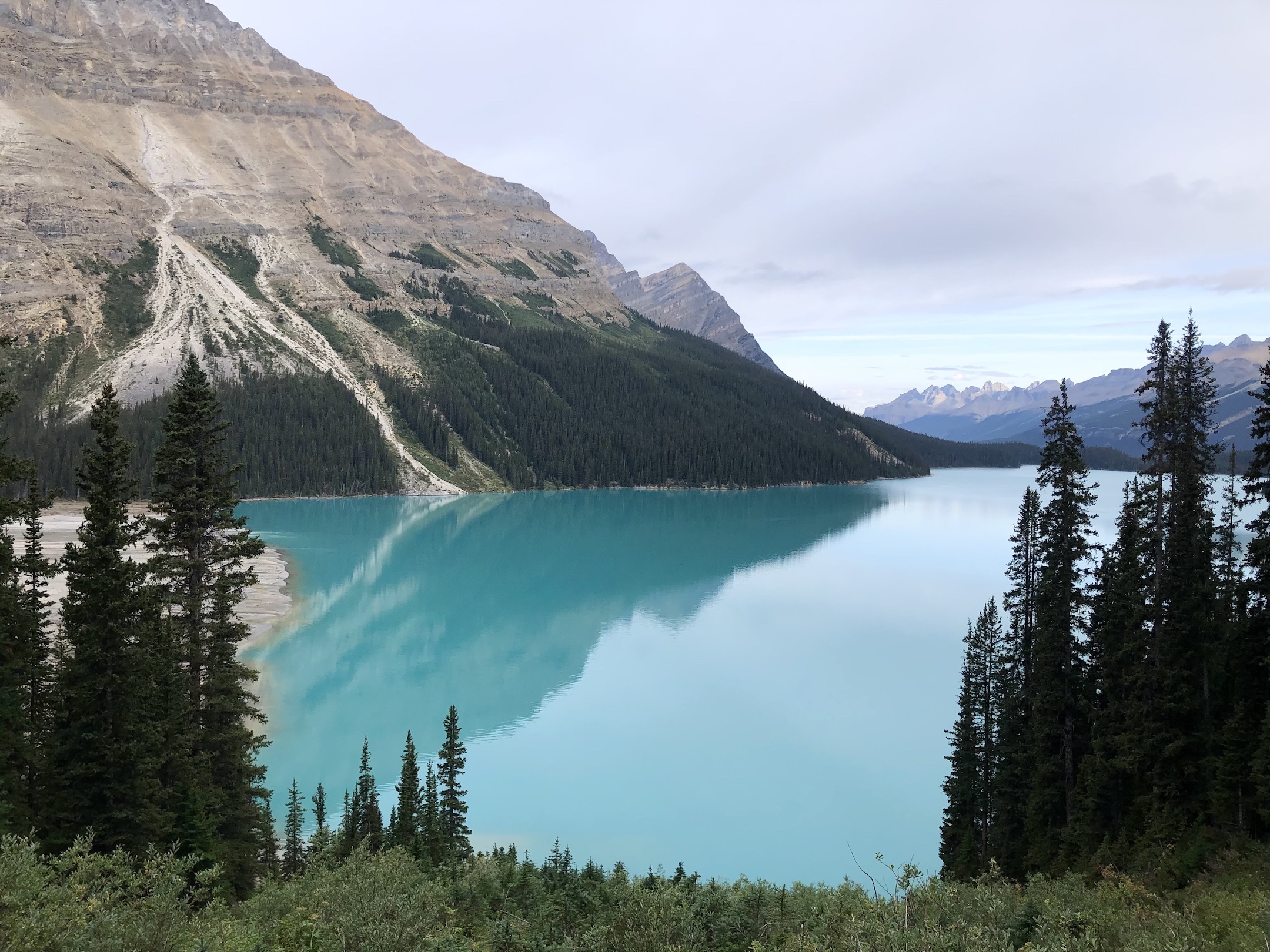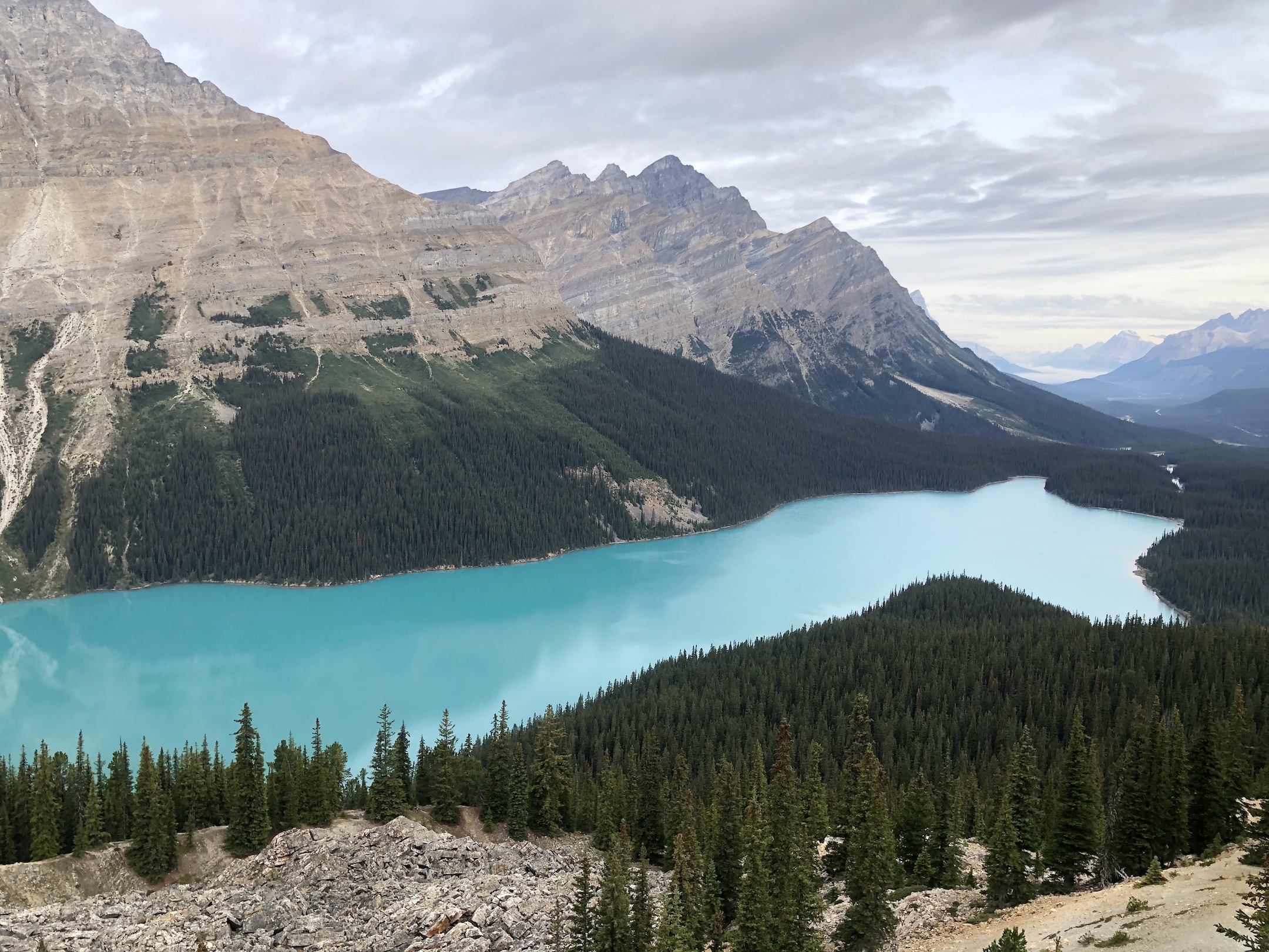 I did not sleep well this first night, but there was no time to dwell on a lack of slumber. Our first day in Banff we decided to do a double – hike the short trail down to Peyto Lake, and then hop over to Helen Lake and say hi to her. We started with Peyto because while there is a path hiking down to the lake, most people take the easily accessible paved path to see the overlook. This makes for a very crowded spot after 0900.