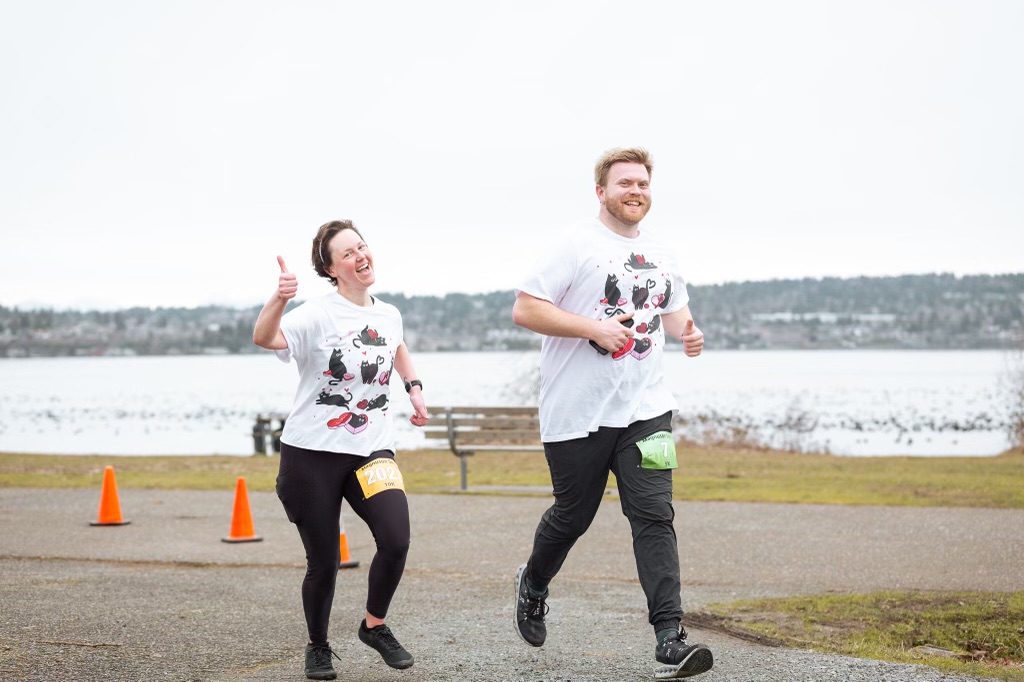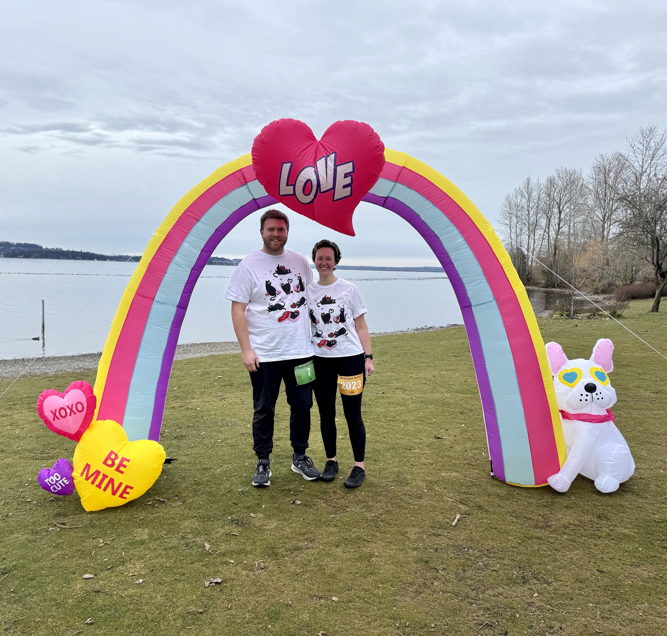 I don’t love driving into Seattle these days, but I knew that might be my only option. I found a race with a 5k, and a 10k option on a looped track which felt too good to be true. I prefer running 10k if given the chance with organized races, so I was able to run the first 5k loop with Duncan and the second 5k loop solo. The run was called “Better Together”, and the website alluded to this being Valentine’s Day themed, so naturally I had to get us matching shirts.
