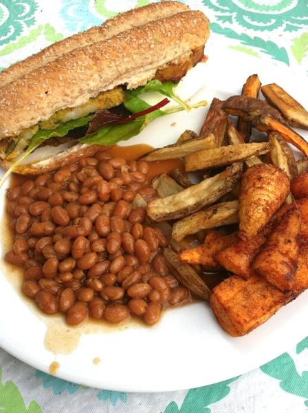 With a cut up potato (french fry style), baked beans, and a vegan vegetable burger!
