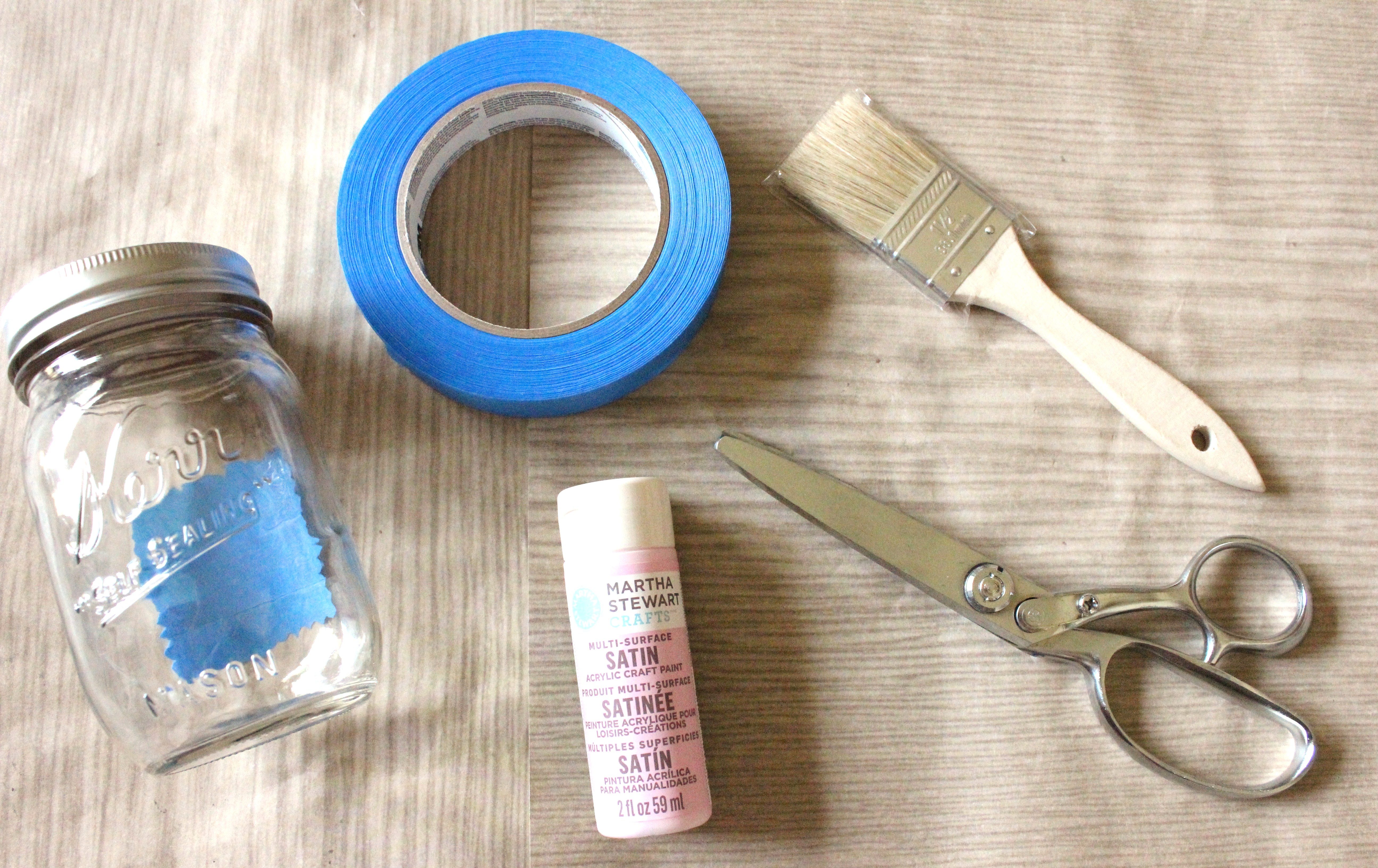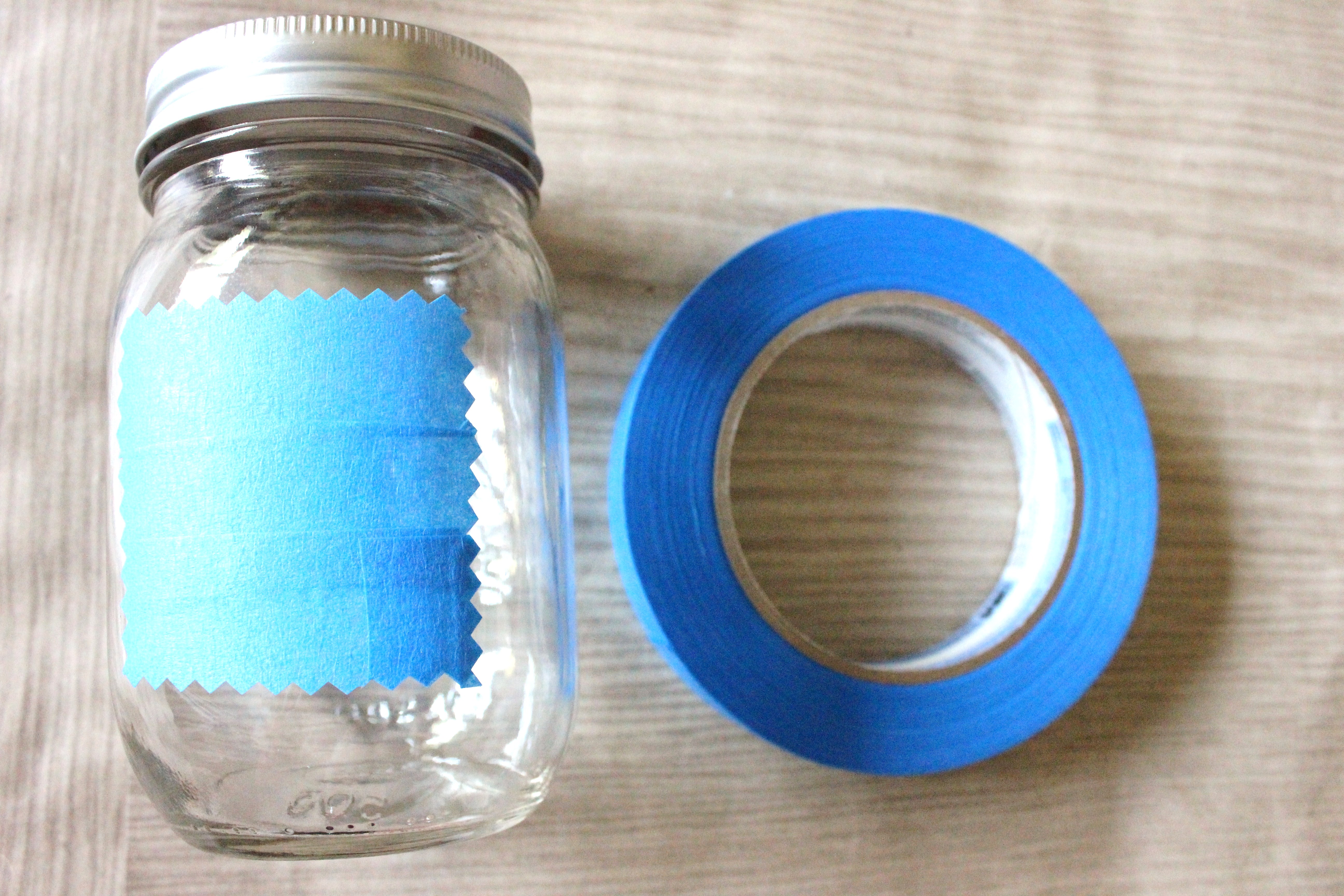 Here’s what I did: I painted my jar over the course of a few days, applying multiple coats. Once I was done I peeled the painters tape off of the front, which ended up making a funky design because the paint dried to the tape making it difficult to remove. Owell.