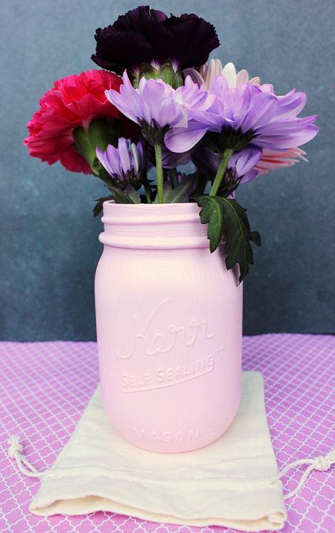 I chose a photo of my sister and I to stick inside the jar, and printed out a wallet size. I used the painters tape to tape the photo to the inside of the jar. You will want to use some kind of small cup to put inside for the water to ensure you don’t ruin your photo, I used a shot glass. I picked 4 random and fun flowers to match the pink vase.