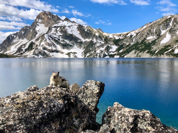 About an hour after we left Alpine Lake we arrived at Sawtooth Lake. This lake is stunning, but the weather was still far too cold to warrant a swim. Instead we quietly savored the views, while making friends with the locals. An adorable and bold little critter would not stop heckling me for some of my snacks.